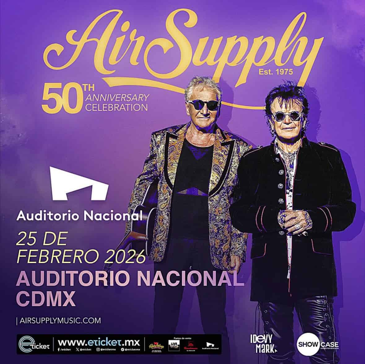 Air Supply, una de las bandas más emblemáticas del soft rock internacional, celebra cinco décadas de trayectoria con un espectáculo muy especial que promete emocionar a varias generaciones. Bajo el nombre “50th Anniversary Celebration”, el legendario dúo llegará a la Ciudad de México para ofrecer una noche cargada de nostalgia, romanticismo y clásicos atemporales que han marcado la historia de la música. La cita será el 25 de febrero de 2026 en el Auditorio Nacional, uno de los recintos más importantes y representativos del país.