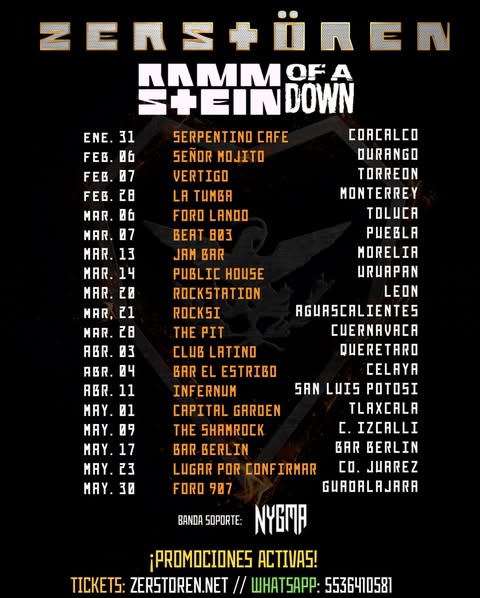 La escena del metal y el rock industrial en México se prepara para vivir una de las giras tributo más intensas del año. Gira Zerstören, un proyecto que rinde homenaje a dos de las bandas más influyentes del metal moderno —Rammstein y System of a Down—, llegará a múltiples ciudades del país con una propuesta sonora potente, visualmente agresiva y cargada de energía. Acompañados por la banda soporte Nygma, esta gira promete noches incendiarias para los fans del metal pesado.