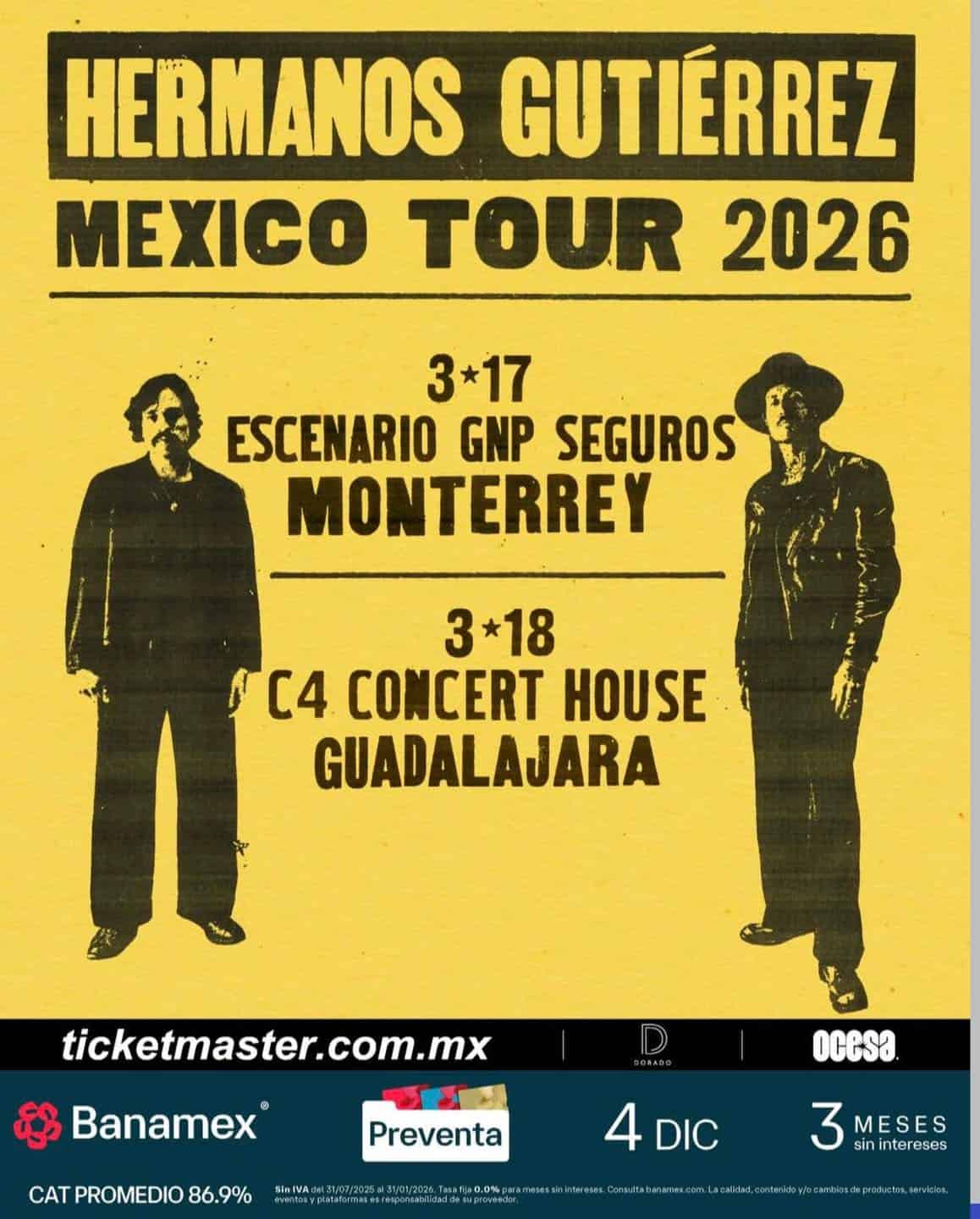 La primera parada del Mexico Tour 2026 será Monterrey, donde el dúo se presentará el 17 de marzo en el Escenario GNP Seguros. Este recinto ha sido elegido por su acústica y su capacidad para crear una experiencia cercana entre los artistas y el público, algo fundamental para el estilo de los Hermanos Gutiérrez, cuya música combina guitarras resonantes, silencios evocadores y una narrativa instrumental muy particular.